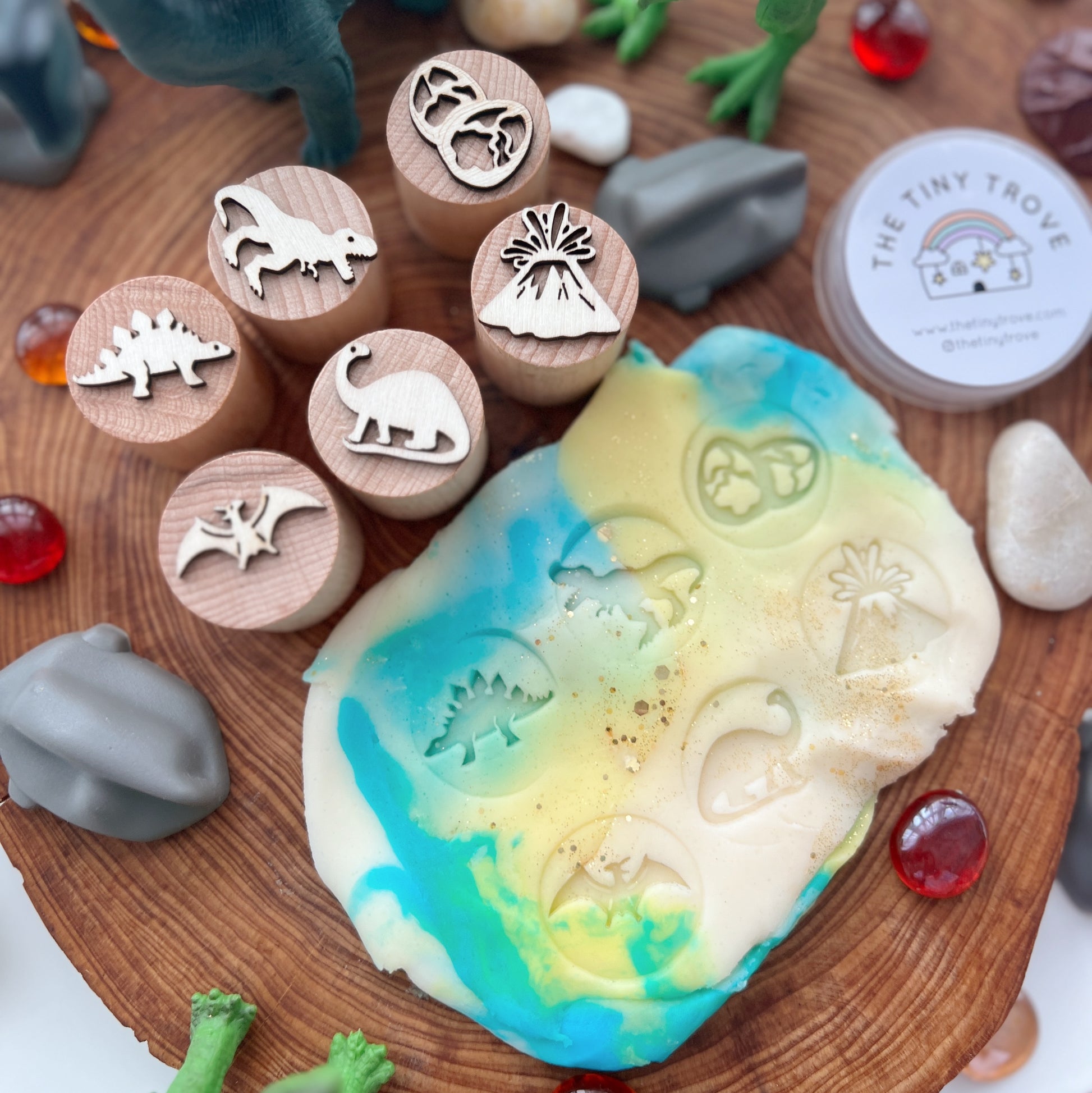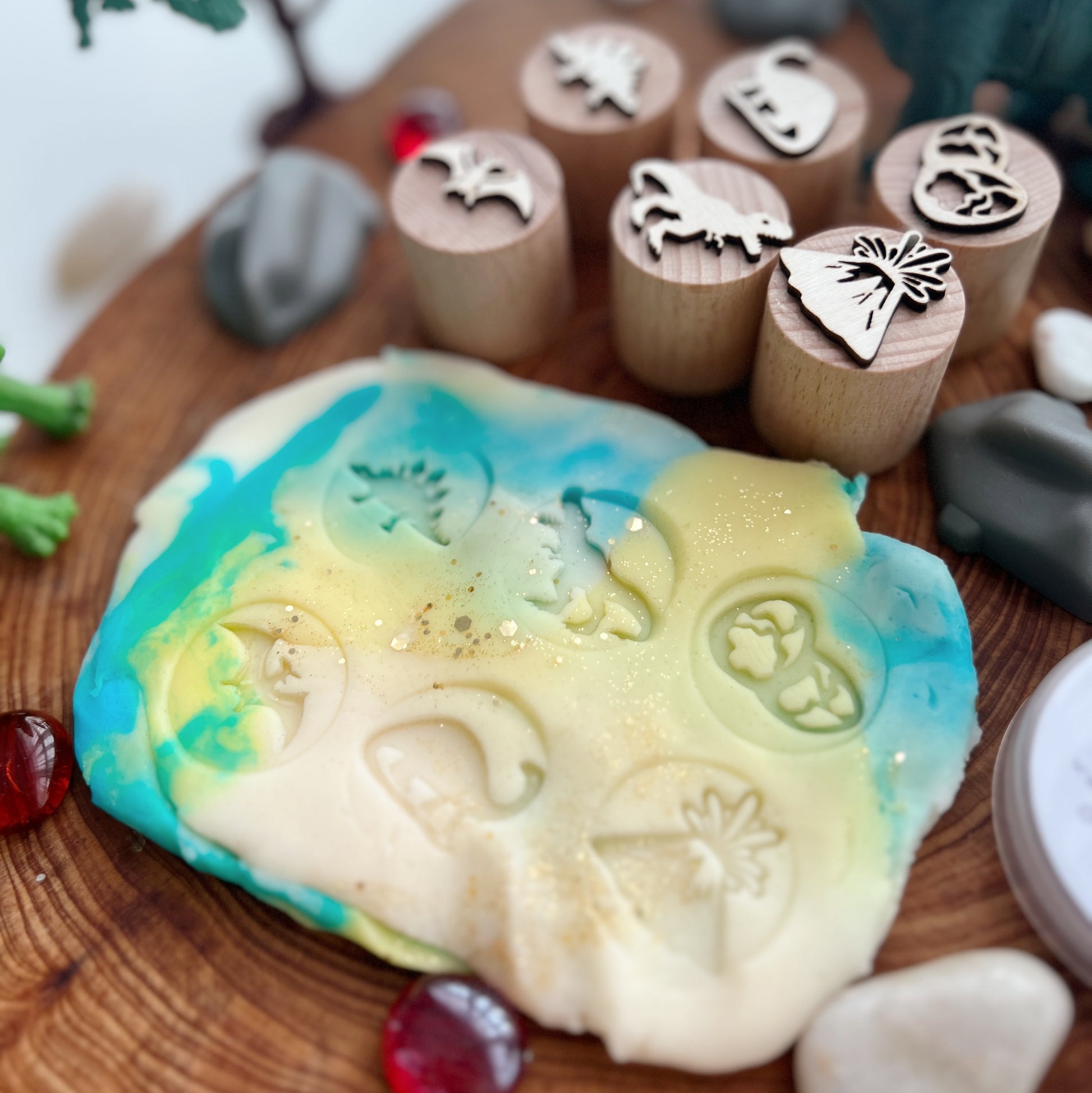 Handmade and crafted using raw wood, these set of 6 wooden stampers are great for a nature-inspired prehistoric dino sensory play! Wooden stampers are great for building fine motor skills, grip strengthen, developing hand-eye coordination and introducing language skills.