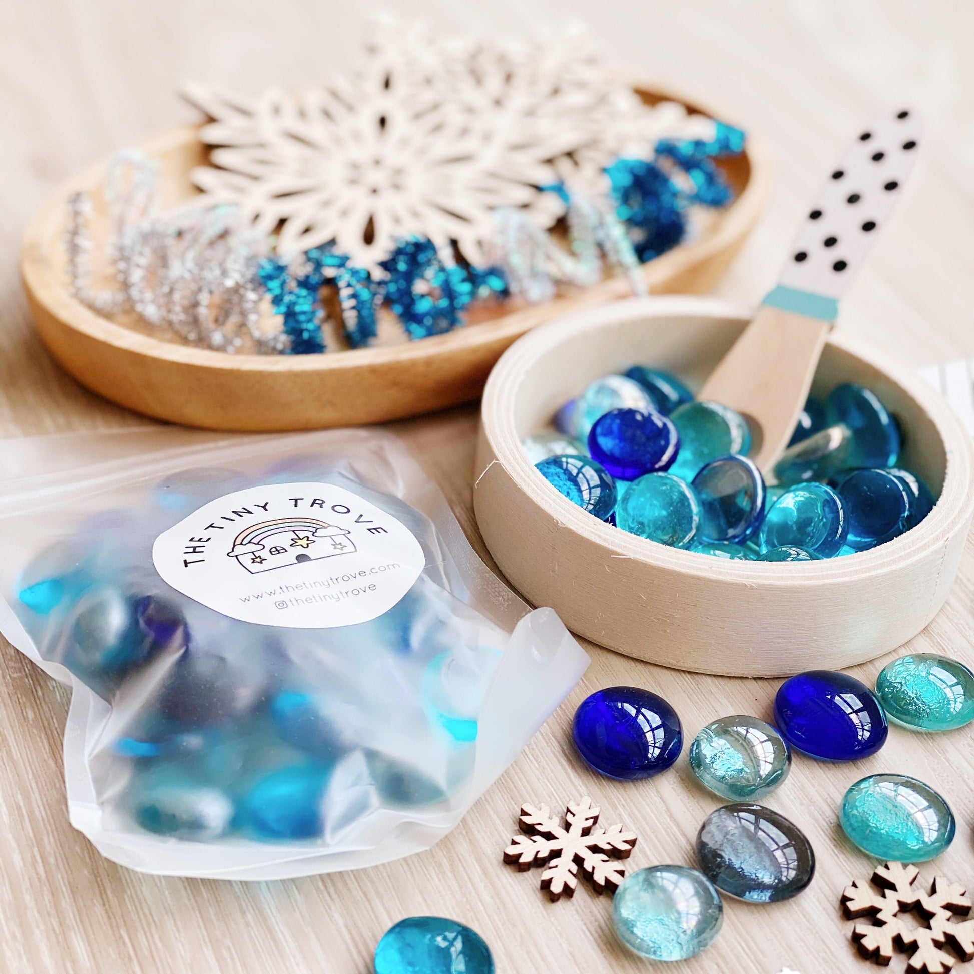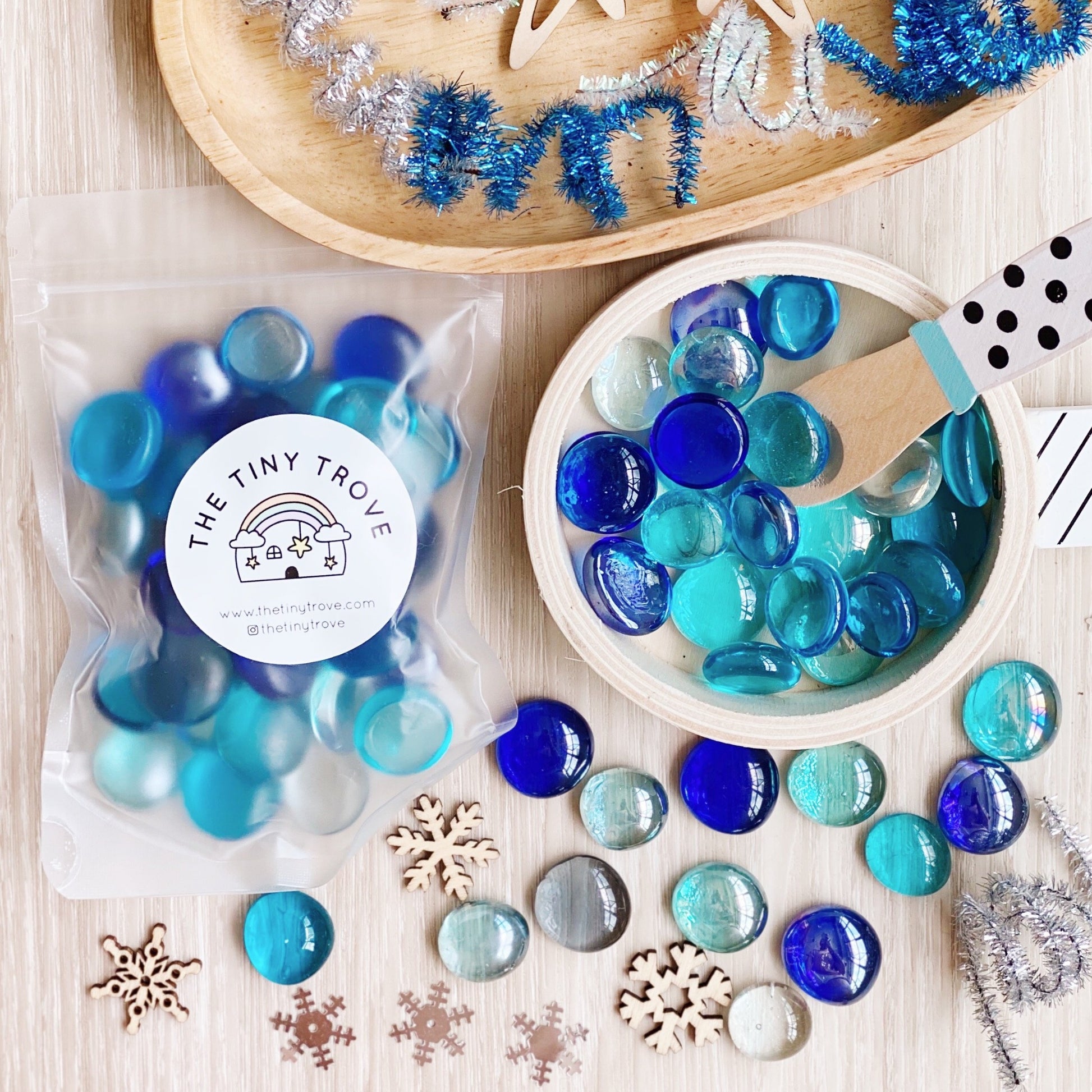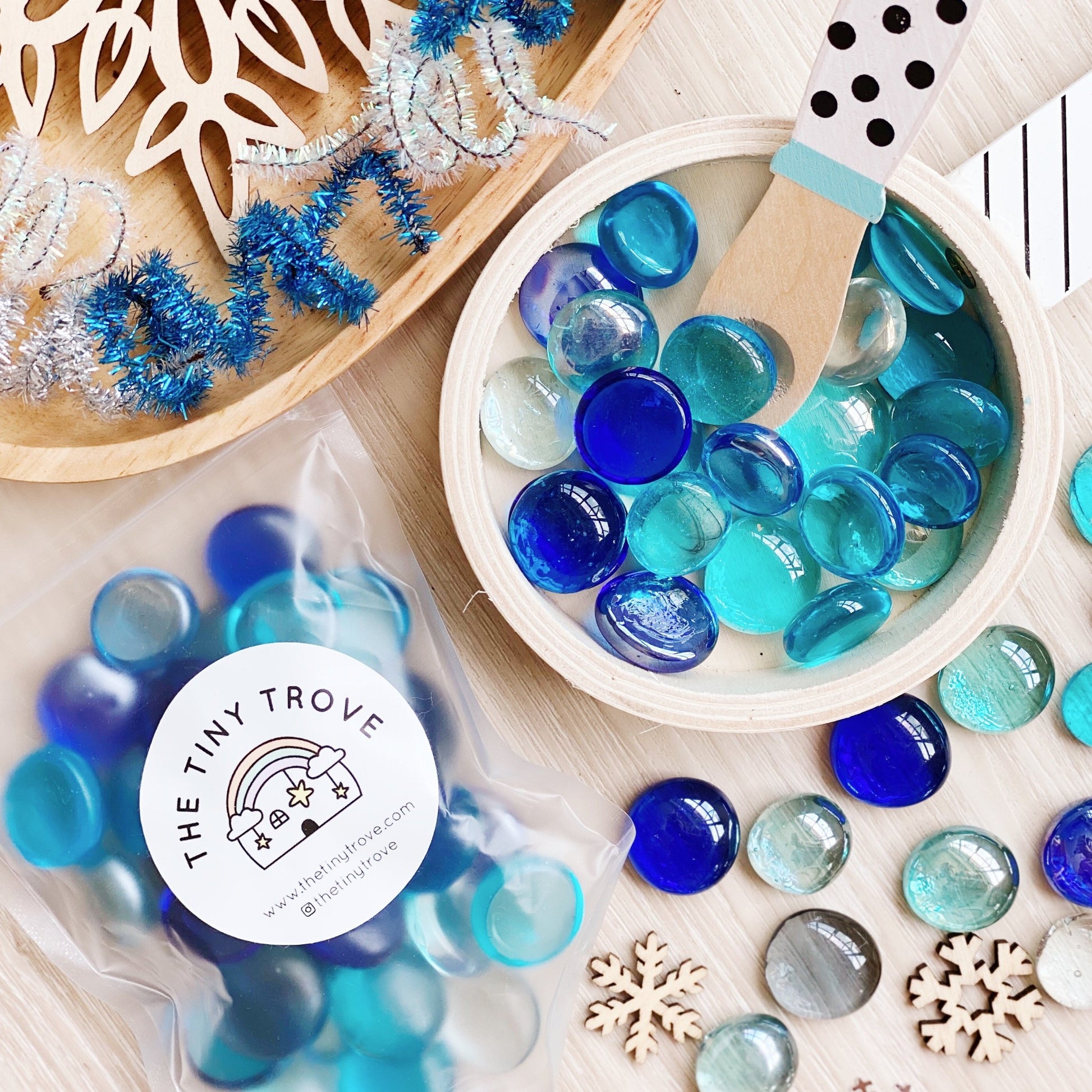A beautiful set of glass pebbles, a perfect addition to small world play or ocean themed play dough fun! Open-ended, limitless and with multiple uses this set of ocean pebbles contains varying shades of blue, aqua and clear. Get ready to have some fun and creative sensory play!