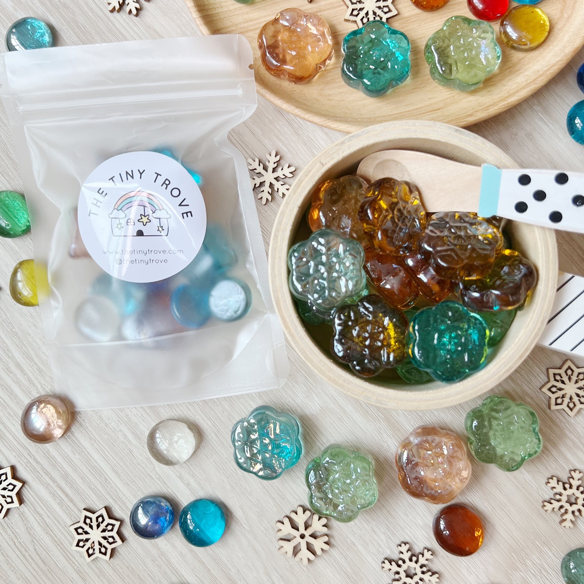 A beautiful set of snow flake glass pebbles and a handful of circular glass pebbles, a perfect addition to small world play or frosted themed play dough fun! Open-ended, limitless and with multiple uses this set of glass pebbles is certain to up your sensory play game! Get ready to have some fun and creative sensory play!