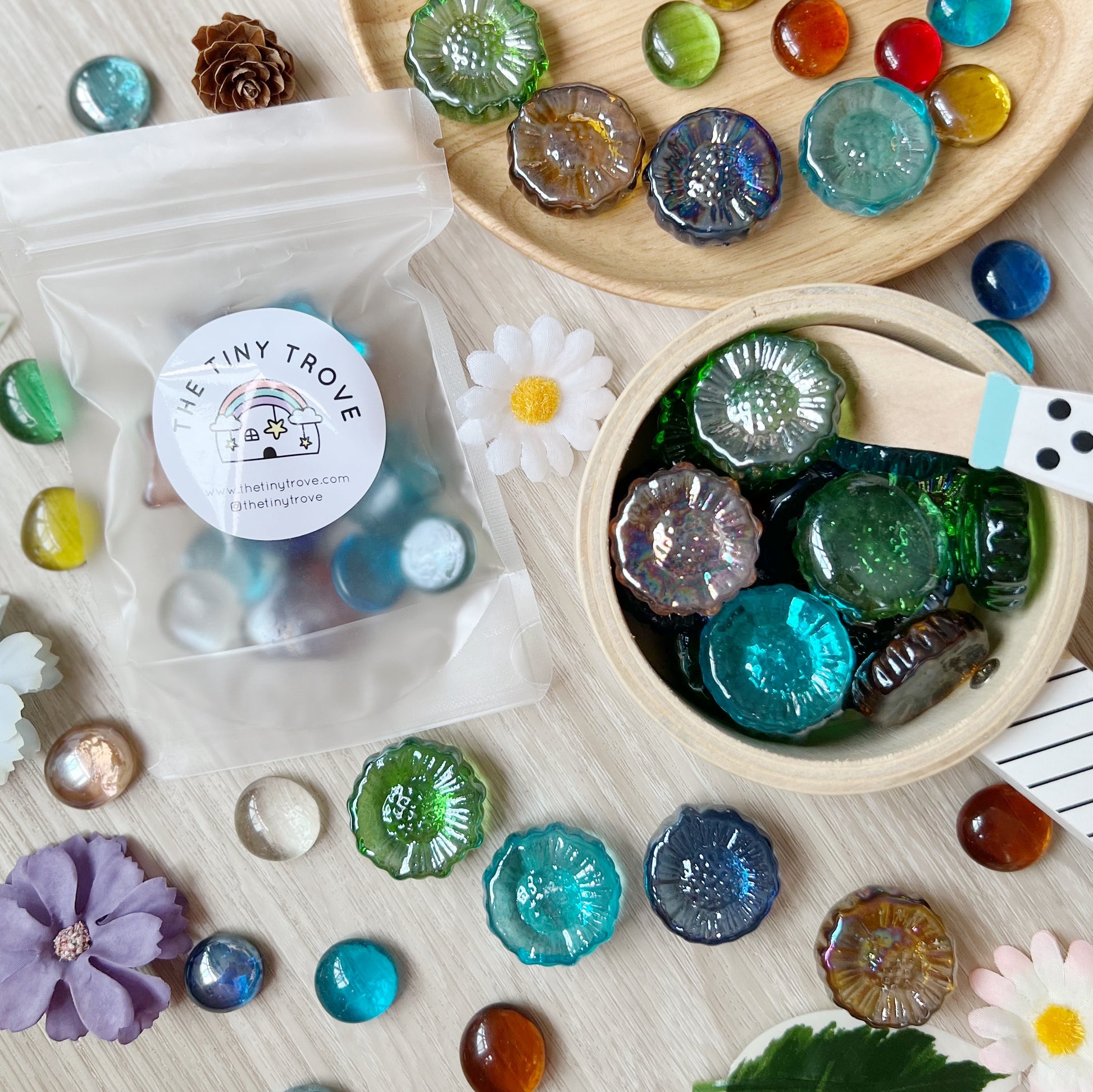 A beautiful set of sunflower glass pebbles and a handful of circular glass pebbles, a perfect addition to small world play or garden themed play dough fun! Open-ended, limitless and with multiple uses this set of glass pebbles is certain to up your sensory play game! Get ready to have some fun and creative sensory play!