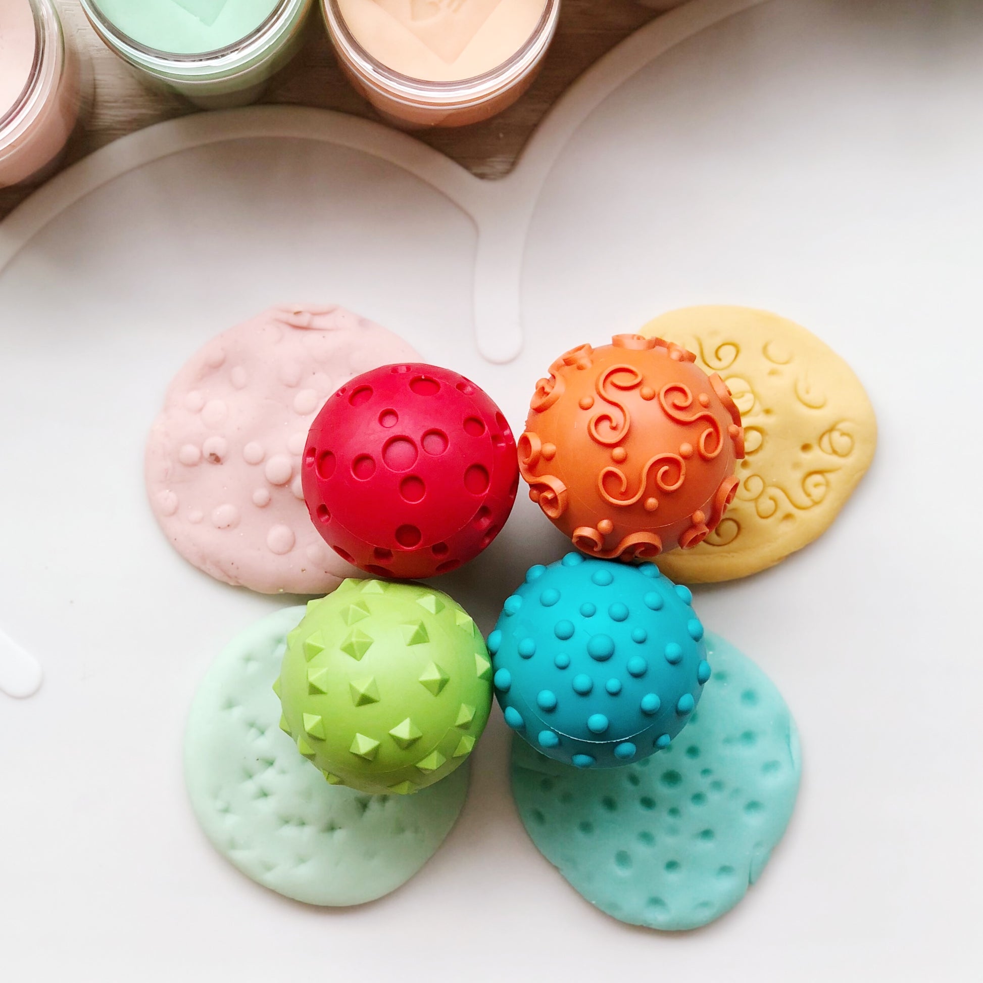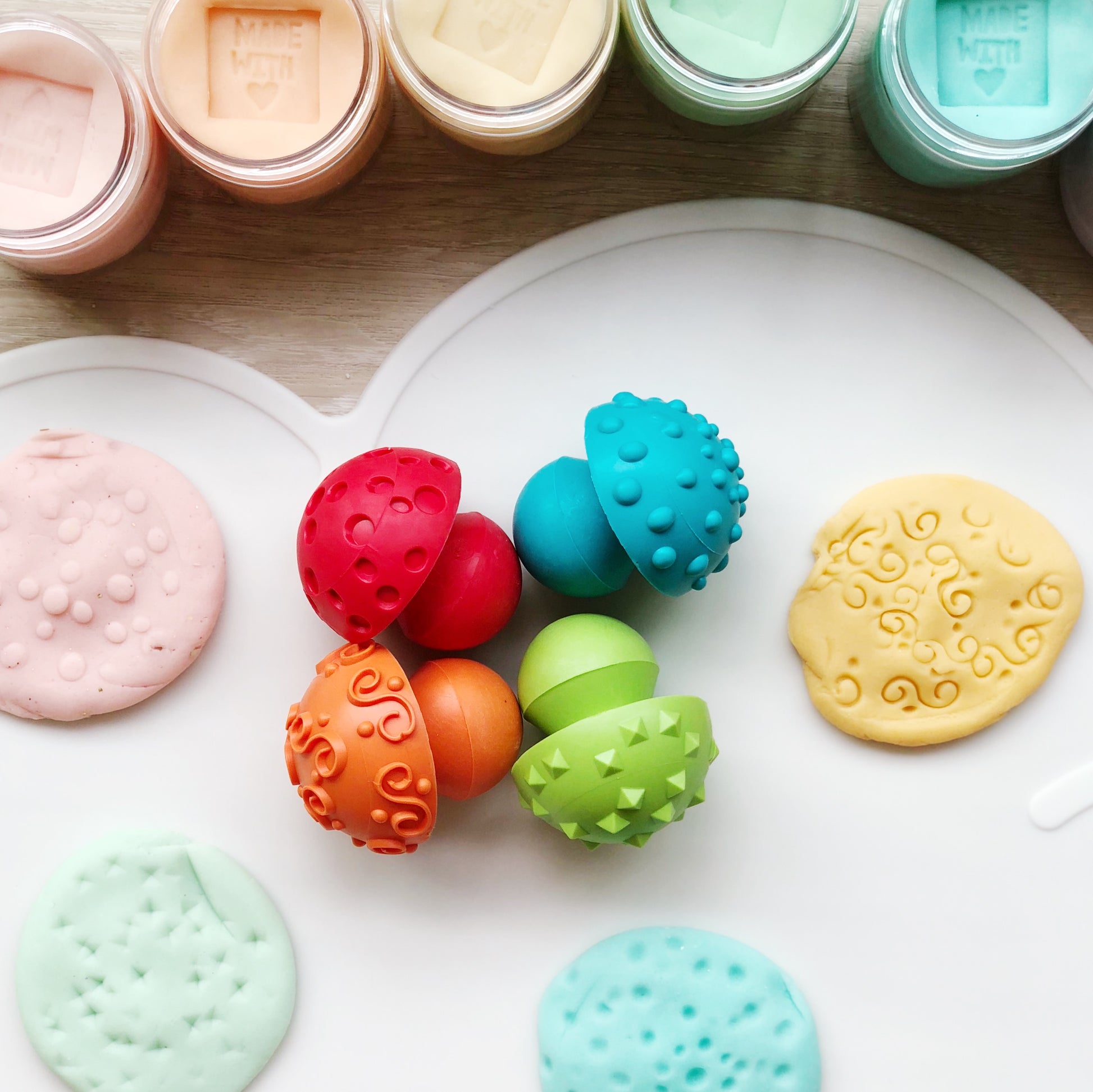 These textured mushroom stampers are ideal for first timers and encourages creative pattern activity for kids as young as toddlers. The knob handle makes it perfect for young tiny hands to grab on to while getting creative with their play. The stampers create beautiful textured designs on the dough and is great for adding details to your dough creations!